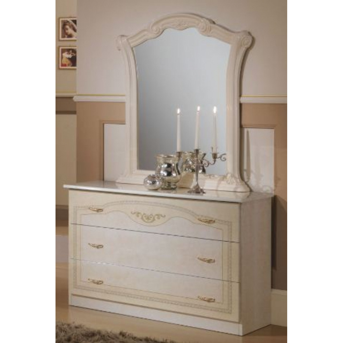 Комод с зеркалом Ирина (беж) от Российской фабрики «ДИА мебель» выполнен в бежевом цвете в сочетании с глянцевым покрытием. Имеет три вместительные, открывающиеся полки. Такой многофункциональный комод поможет Вам с экономить место в спальне. Большое зеркало поможет визуально расширить комнату. Коллекция "Ирина" предназначена для настоящих ценителей классического стиля.