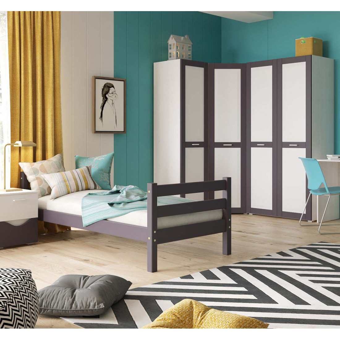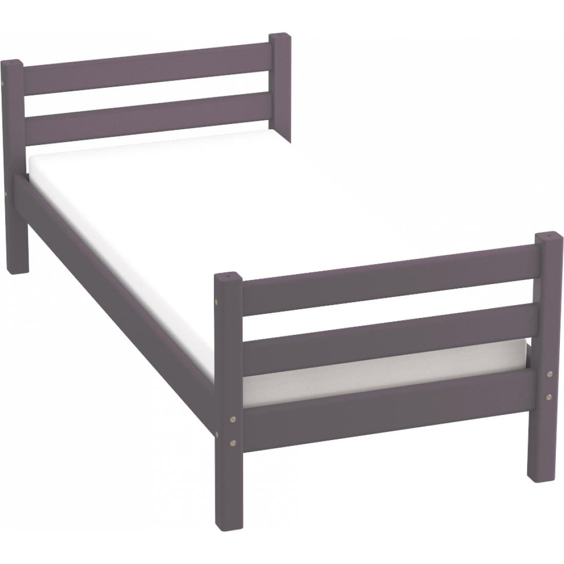 Кровать выполнена из массива дерева, может комплектоваться выкатными ящиками и аксессуарами из текстиля. Отделка выполнена эмалью AqaLAC с добавления красителя цвета "Лаванда".