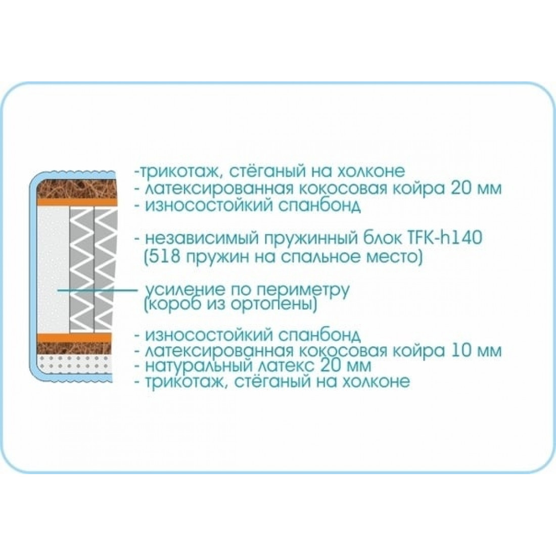 Наполнение: независимый блок TFK, высота блока 140 мм, латекс 20 мм с одной стороны, кокосовая плита 10/20 мм с 2-х сторон, износостойкий спанбонд с двух сторон, усиление по периметру - короб из ортопены.
