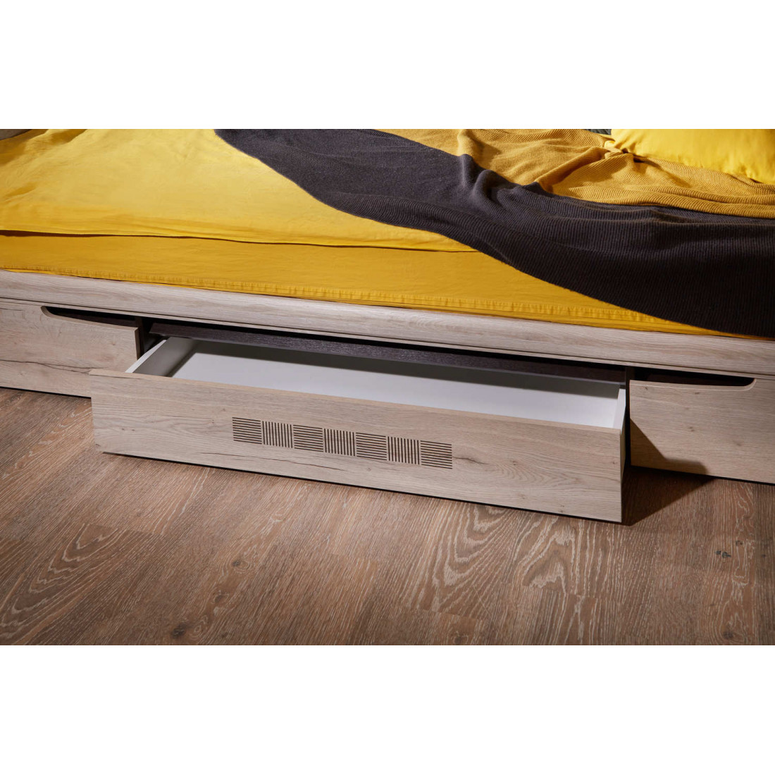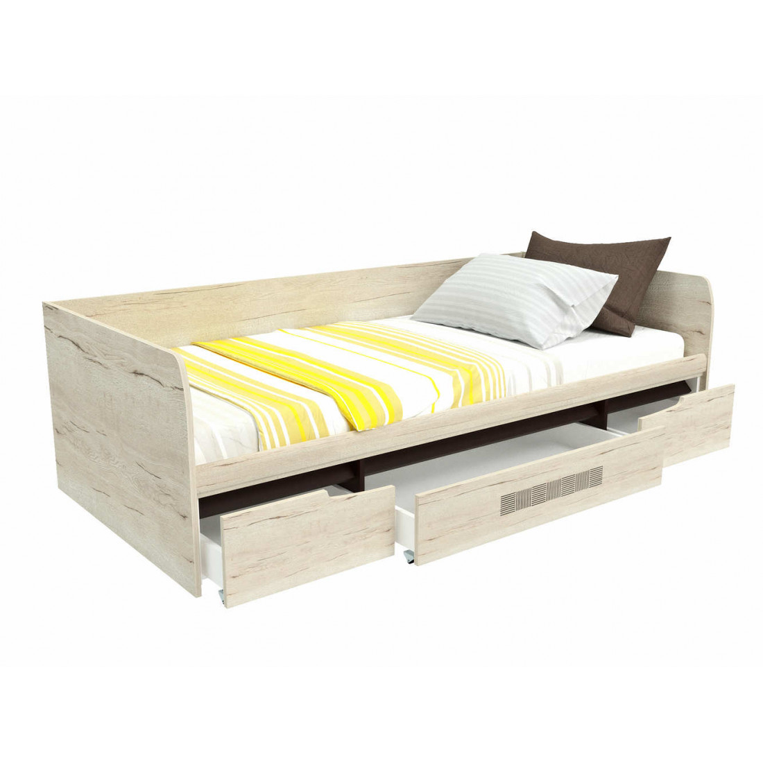 Кровать односпальная с ящиками Мале - обладательница лаконичного и свежего дизайна. Она является представителем коллекции «Мале». В этой коллекции особое внимание уделено внешнему виду и тактильным ощущениям от прикосновения к мебели, схожей с натуральным деревом по рисунку и шероховатости.
