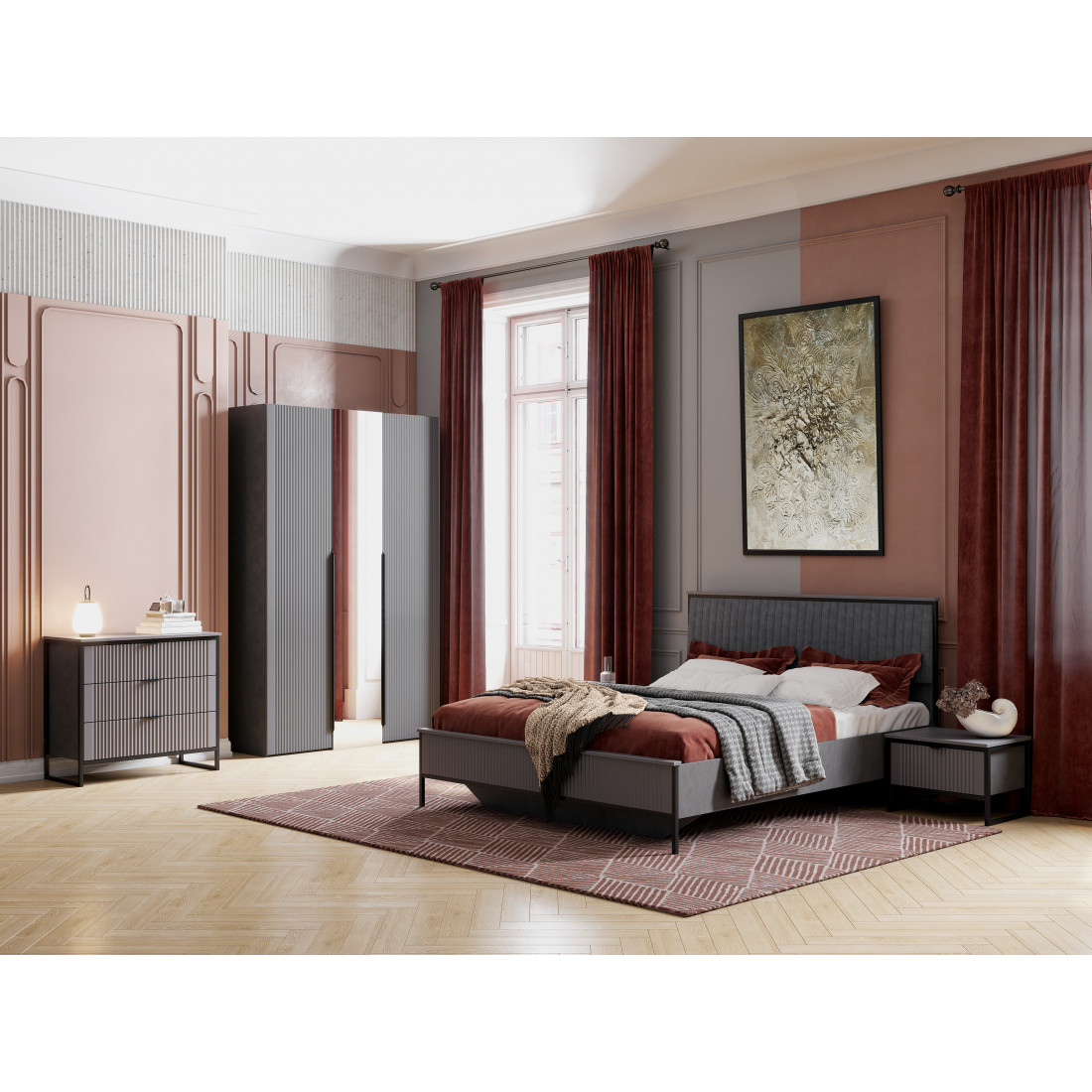 Коллекцию модульной спальни "Нора" отличает современный оригинальный стиль. Декоративная продольная фрезеровка на МДФ фасадах цвета "Графит" и опоры на металлокаркасе цвета "Черная эмаль" соответствуют модным тенденциям этого года в ведущих зарубежных коллекциях. Дизайн коллекции гармонирует со стилем минимализм и лофт.